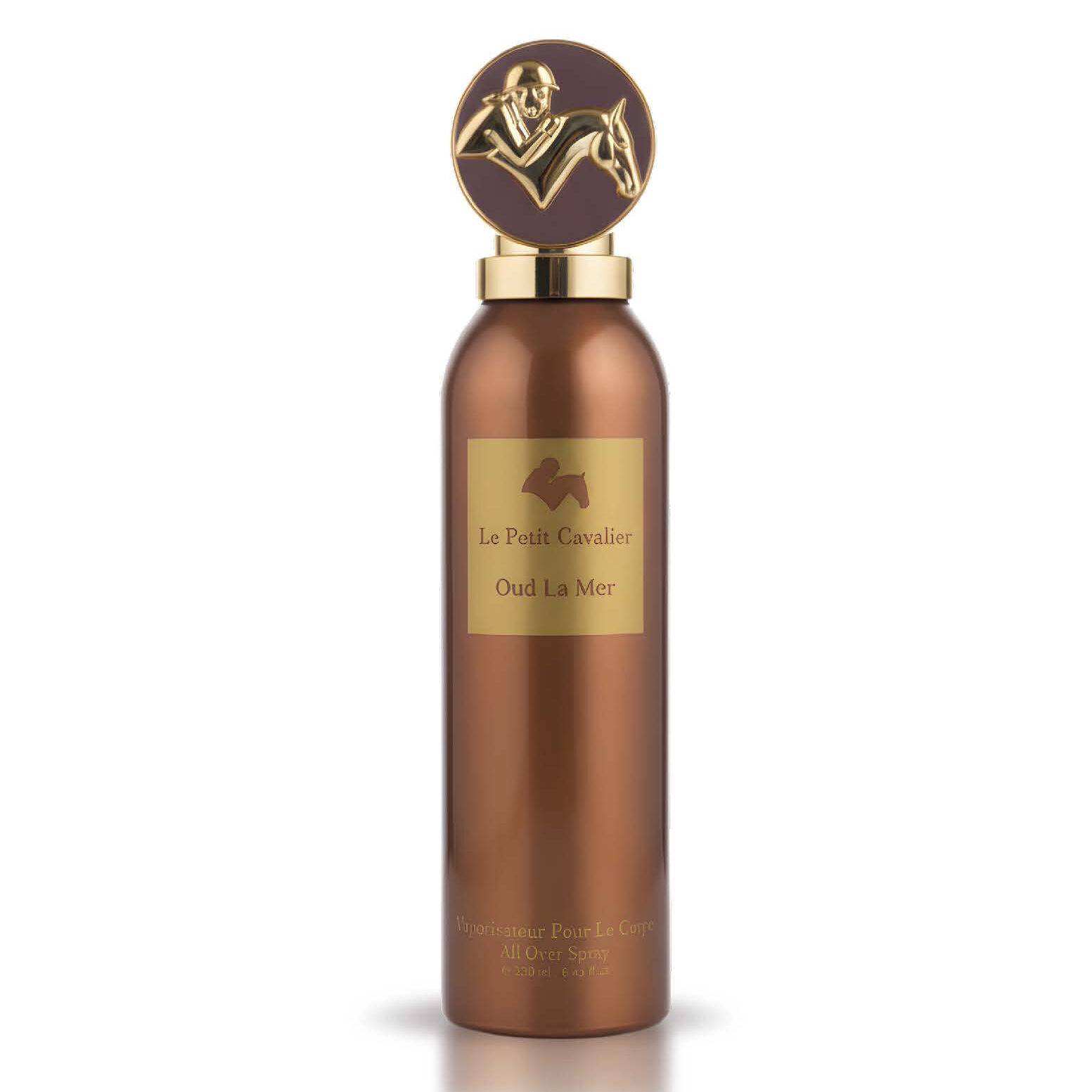 The bottle features a deep bronze tone with elegant gold details. Consequently, the design reflects richness, balance, and oriental luxury. It also matches the refined identity of Le Petit Cavalier.